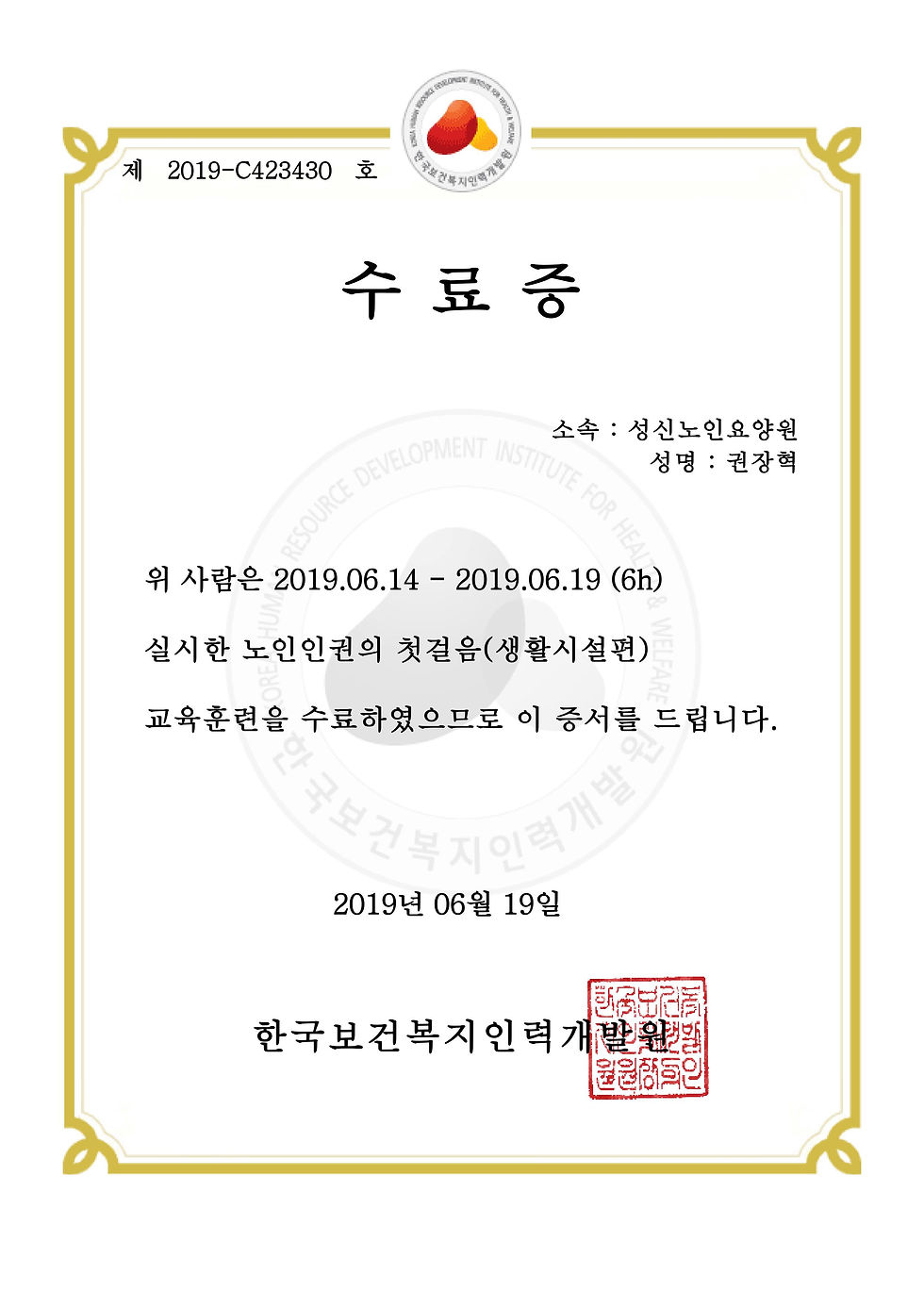 저희 시설장이하 전직원들이 2019년 노인학대예방과 노인인권에 대한 교육을 모두 마쳤습니다. 앞으로도 어르신들을 더 잘모시기 위해 꾸준한 공부와 노력을 게을리하지 않도록 하겠습니다. 감사합니다. 성북구 성신노인요양원 교육수료